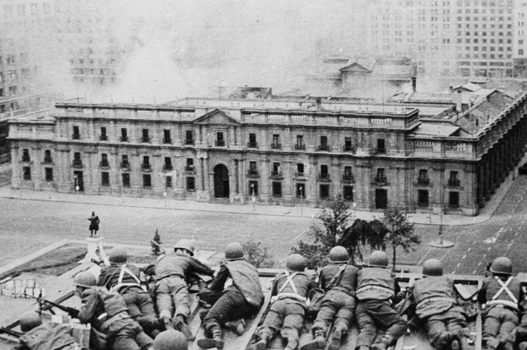 Soldiers supporting the coup led by General Augusto Pinochet take cover as bombs are dropped on the presidential palace, La Moneda, on September 11, 1973.The Canadian Press -