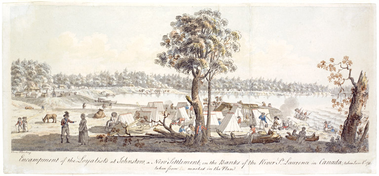 An encampment of Loyalists at Johnstown (now Cornwall, Ontario), June 6, 1784, as sketched by James Peachey.Library and Archives Canada -