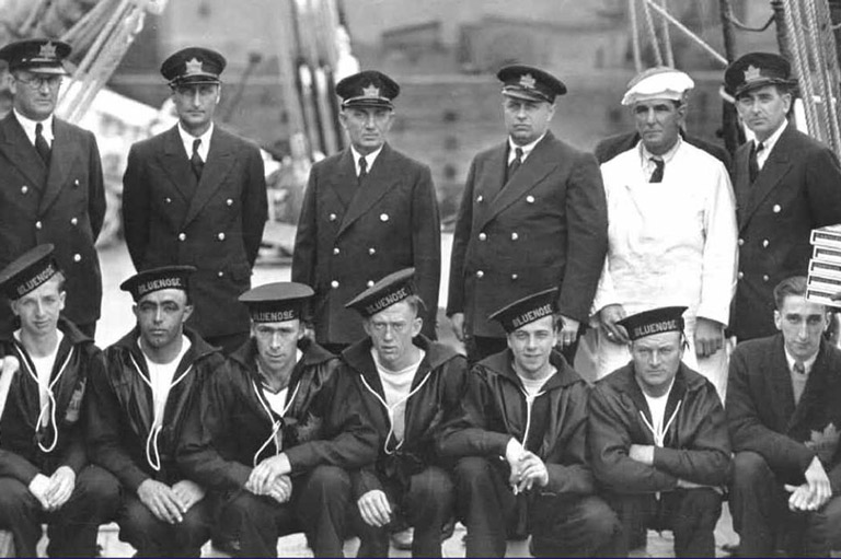 Captain Angus Walters (back row, third from left) and crew pose on the deck of the Bluenose in this undated photo.Nova Scotia Archives -