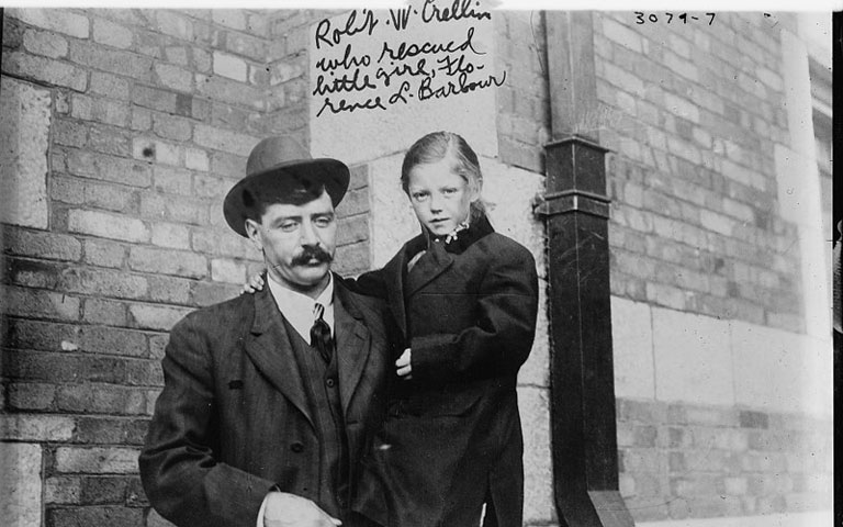 Robert W. Crellin holds Forence L. Barbour, who he rescued from the sinking.Library of Congress -