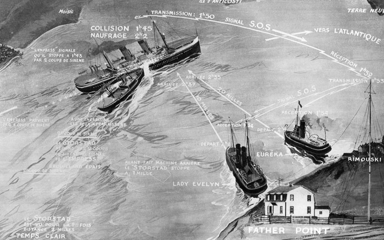 A map showing the Storstad ramming the Empress.Site historique maritime de la Pointe-au-Père -