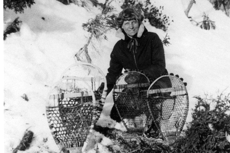 Nurse Kathleen "Jo" Lutely with snowshoes she used for her journeys on foot to see patients, circa 1940s.Memorial University -