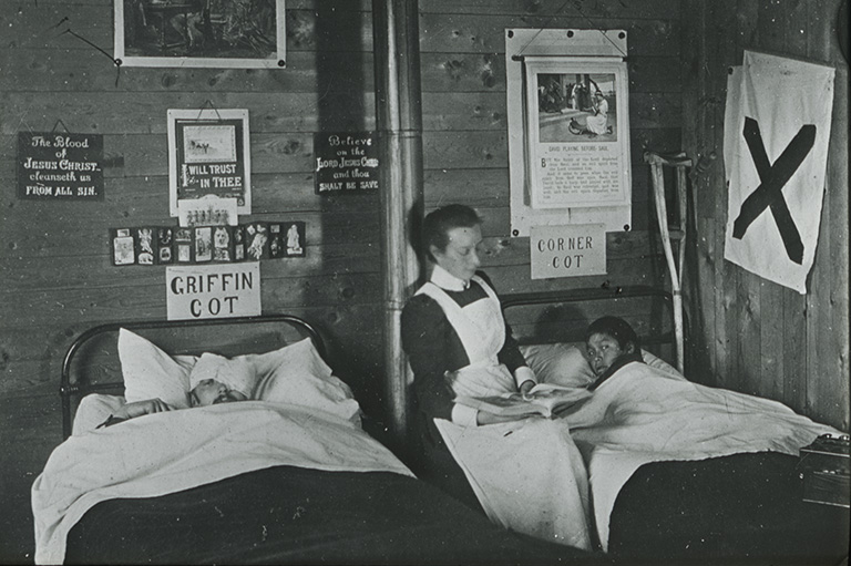 A nurse reads to a young patient at Battle Harbour Hospital, 1893.The Rooms Provincial Archives -