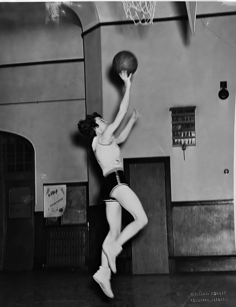 During the Grads’ time, there were two versions of basketball rules: women’s and men’s. Women were restricted to two-thirds of the court, only two bounces before a pass and other restrictions. Eastern Canada (mostly just Ontario and Quebec) used women’s rules; Western Canada used men’s rules. The Grads’ coach much preferred the men’s rules because the American teams who came to Edmonton used them. When the Grads travelled east, they mostly had to play women’s rules, and sometimes, games were played with one-half women’s and one-half men’s.