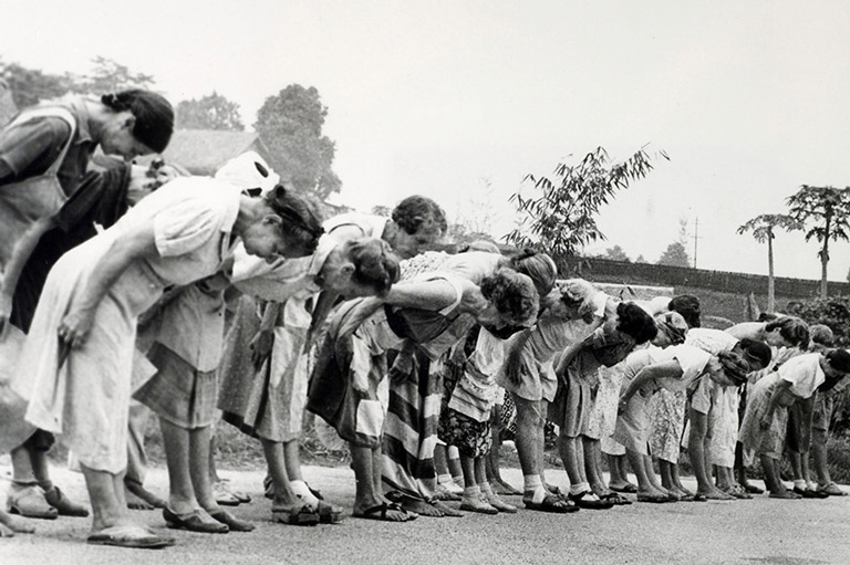 Civilian prisoners in Singapore, circa 1945. They were required to bow to their Japanese captors during daily roll call.Getty -