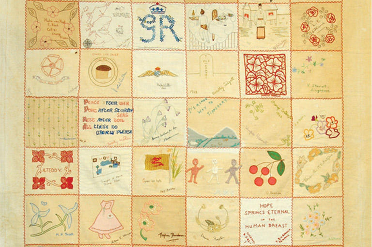 A quilt made at Changi prison in 1942 by female internees.London Red Cross
