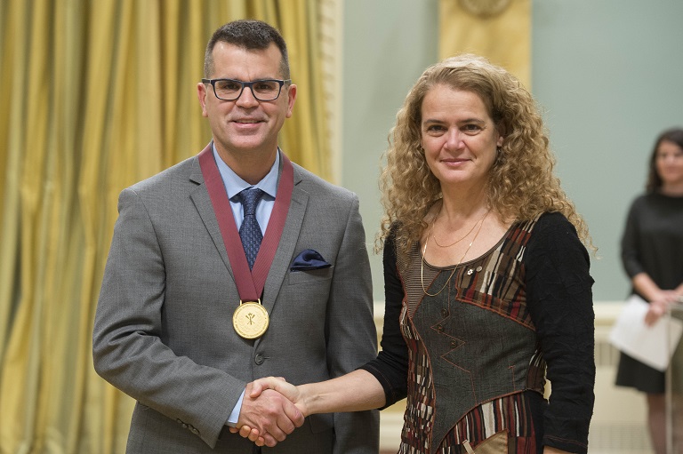 Her Excellency, the Right Honourable Julie Payette, shakes hands with Rob Flosman, recipient of the Governor General's History Award for Excellence in TeachingMCpl Vincent Carbonneau, Rideau Hall © OSGG, 2017. -