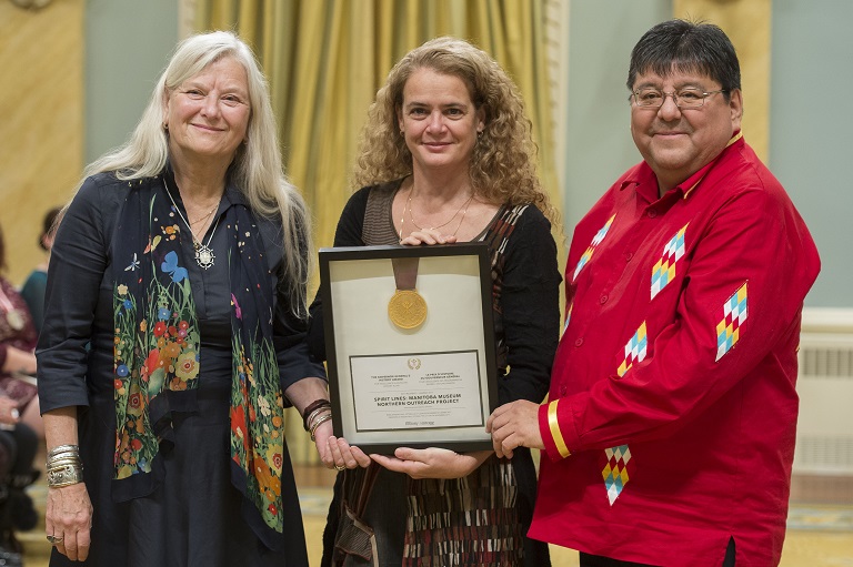 Her Excellency, the Right Honourable Julie Payette (centre) and Dr. Maureen Matthews (left) and David Swanson (right), recipients of the Governor General's History Award for Excellence in Museums: History Alive!MCpl Vincent Carbonneau, Rideau Hall © OSGG, 2017. -