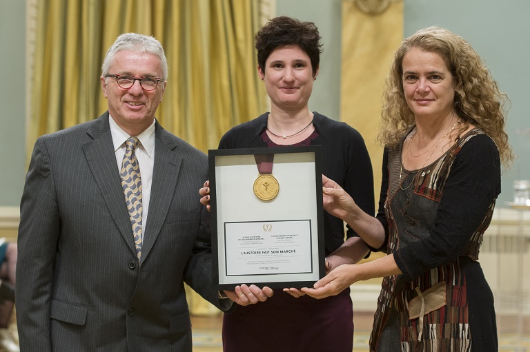 Her Excellency, the Right Honourable Julie Payette presents the Governor General's History Award for Community Programming to Michel Harnois and Marie-Ève Gingras, from the Sherbrooke Historical SocietyMCpl Vincent Carbonneau, Rideau Hall © OSGG, 2017. -