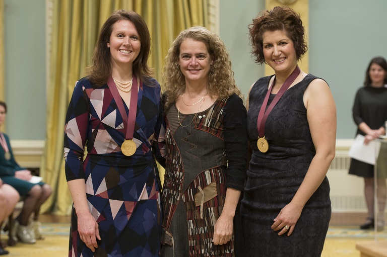 Her Excellency, the Right Honourable Julie Payette, Governor General of Canada (centre) with teaching recipients, Leia Laing (left) and Naomi Fortier-Fréçon (right)MCpl Vincent Carbonneau, Rideau Hall © OSGG, 2017. -