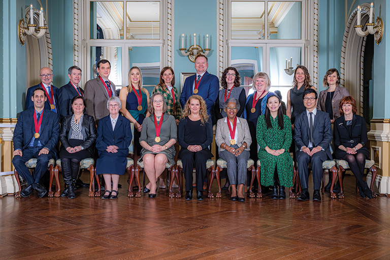 Governor General Julie Payette (front row centre) at Rideau Hall in Ottawa with recipients of the 2019 Governor General’s History Awards and Canada’s History Society President & CEO Janet Walker (front row far right).MCPL MATHIEU GAUDREAULT, RIDEAU HALL, OSGG-BSGG, 2020. -
