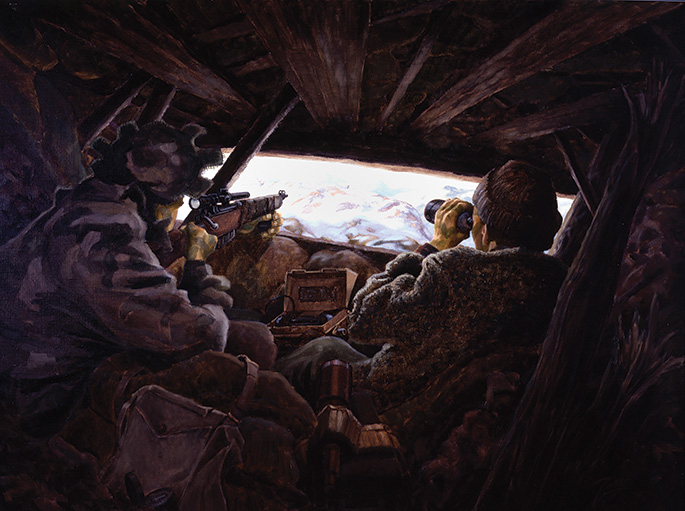 “First Kill” depicts the artist, Ted Zuber, making his first hit as a sniper in Korea.Ted Zuber / Canadian War Museum -