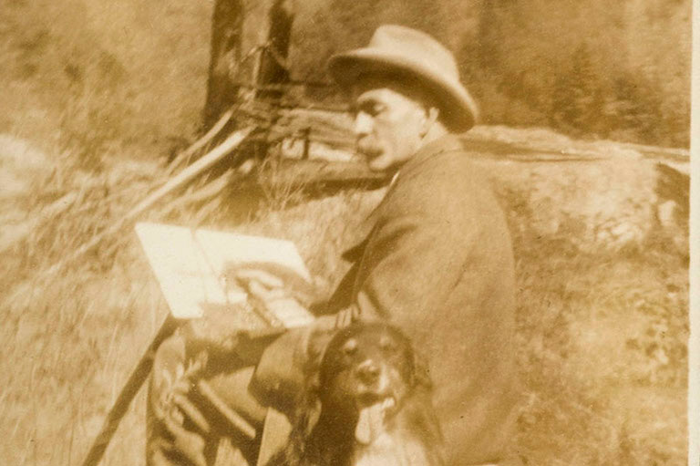 Francis Fitz Roy Dixon at work sketching with his dog at Cascades, Quebec, circa 1911.Courtesy of Jon Dellandrea
