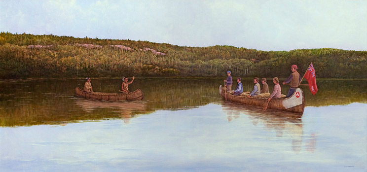 A canoe brigade traversing Lake of the Woods is intercepted by local aboriginals demanding toll to permit passage through their territory.Don McMaster -