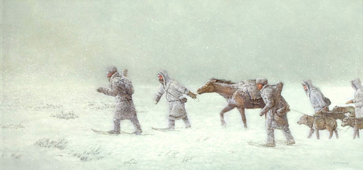 In this painting, Thompson's men drag in to camp a man who went missing during the December 10 storm.Don McMaster -