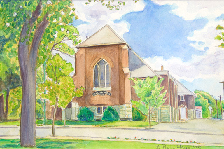 Over the past decade, Hayes has painted scenes related to the nineteenth century — the time when the Selkirk Settlers immigrated to Manitoba from Scotland. He recently donated one of his works to the Old Kildonan Presbyterian Church, built in 1853–4 for the Selkirk Settlers in what is now north Winnipeg, but also the location of Hayes’ 2008 wedding.