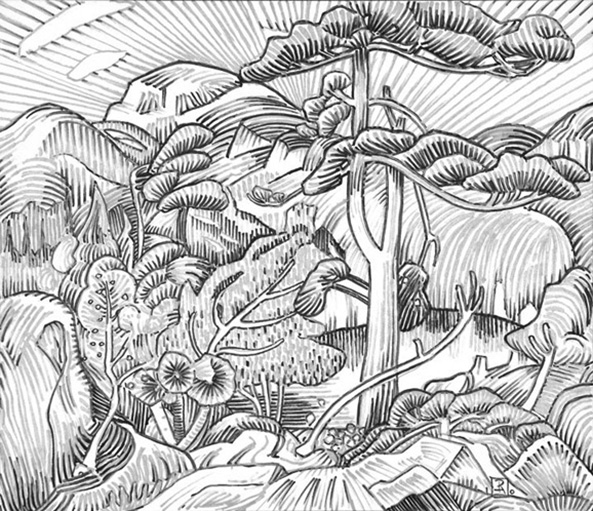 The images shown here are from Hayes’ recent work, which includes watercolour paintings and drawings resembling woodcuts that were made with felt pens.