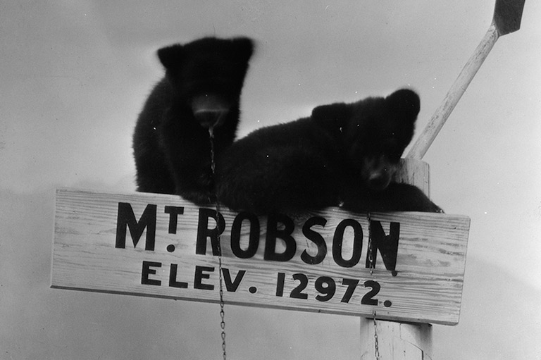 Bear cubs on a signpost at Mount Robson, Alberta, circa 1920s.Library and Archives Canada -
