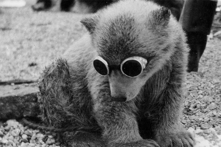 A polar bear cub is photographed wearing snow goggles on Southhampton Island, Nunavut, circa 1942-44Library and Archives Canada -