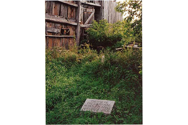 There is no orchard on the McIntosh homestead anymore, only a couple of houses and broken-down barns. A plaque, erected by the Ontario Archaeological and Historic Sites Board, stands a few steps from the road, next to a monument put up in 1912 bearing the erroneous information that John McIntosh found his seedling in 1796. The latter also tells any who happen by that the original tree was some “20 rods” (100 metres) to the north.