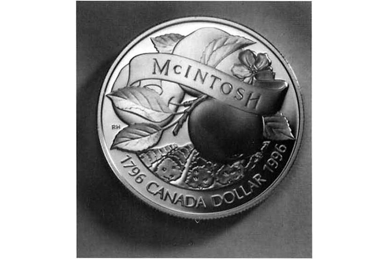 The 1996 Canadian Silver Dollar coin, designed by artist Roger Hill, to commemorate "Canada's Premiere Apple".Royal Canadian Mint -