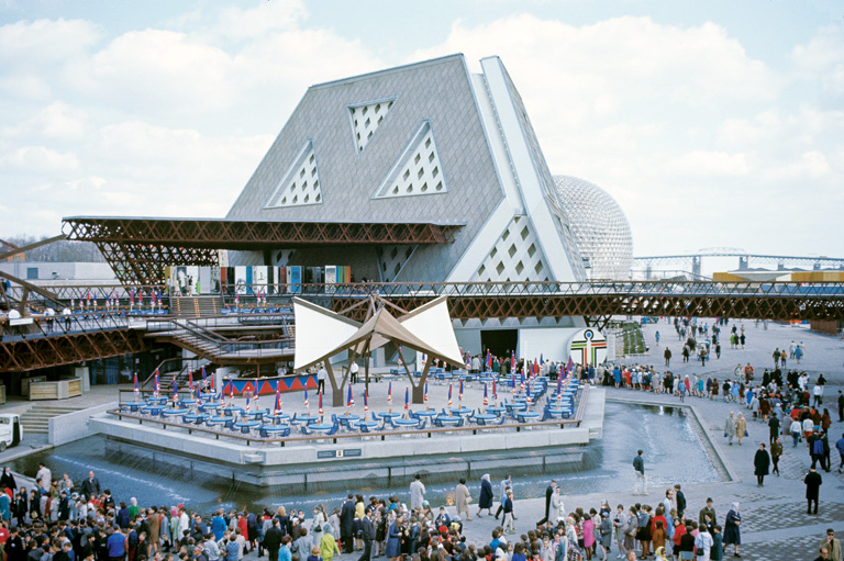 Expo 67 made architectural flights of fancy possible: cubist and traditional, shingles, ceramic, steel, concrete, and logs. The German pavilion was a fifteen-storey plastic tent. The Dutch pavilion was a giant assembly of aluminum tubes. With Habitat 67 and the geodesic dome, architects Moshe Safdie and Buckminster Fuller left Montreal two monuments that would become part of its lasting identity.