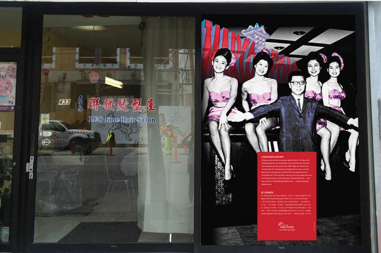 Storefronts in Vancouver's Chinatown display scenes from the neighbourhoods past. The Chinatown History Windows Project features twenty-two historical photographs.Courtesy of Catherine Clement