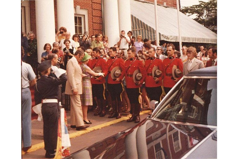 In the summer of 1973, while posted to Prince Edward Island, I was selected to be the official RCMP driver for Her Majesty Queen Elizabth II and her husband, Prince Philip while they were on Royal Tour in Charlottetown, Summerside, and Mount Carmel. They were participating in the Island's celebration of PEI's entry into Confederation. In the photo, Her Majesty is shaking hands with me and saying thank you for being her driver. The top of Prince Philip's head behind her can also be seen. At the time, I was a Constable with the Charlotte Highway Patrol. The photo was taken by RCMP Staff Sergeant W.R. 'Bill' Haines in front of the Charlottetown Inn where the Royal couple had resided.