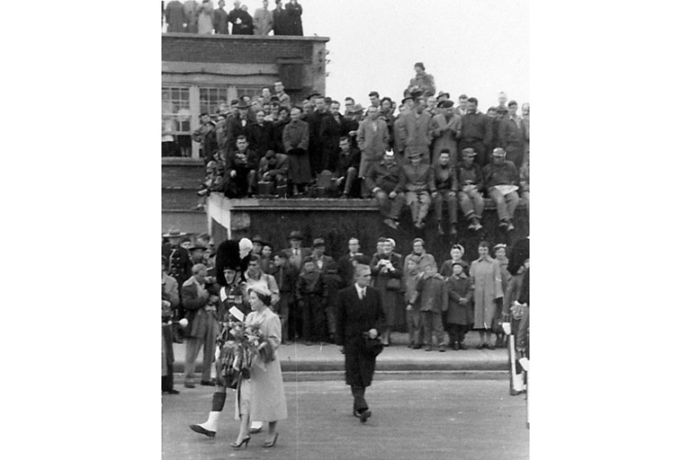 In 1951, then-Princess Elizabeth, with Prince Philip, toured Canada and stopped in my hometown, Kapuskasing, to tour the Spruce Falls Power & Paper company mill (newsprint/Kleenex). Although I was not born at that time, I am the Curator of Kap's museum and have created an exhibit of her visit to my town. They arrived on Tuesday, October 16th, 1951, met with the Legion Guard of Honour, with children in The Gore, stayed at the Kapuskasing Inn, toured the mill and attended a reception at the Community Club. It was a real treat for Kap residents. In the attached photo, Princess Elizabeth walks with Kapuskasing Mayor Alex Stevenson.