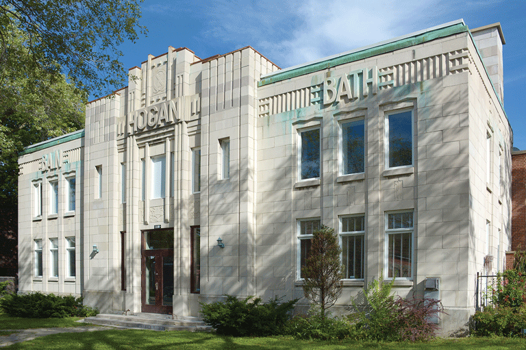 The main facade of the Hogan Bath in Montreal uses step-back massing and vertical grooves.Photo Mike Streicher -