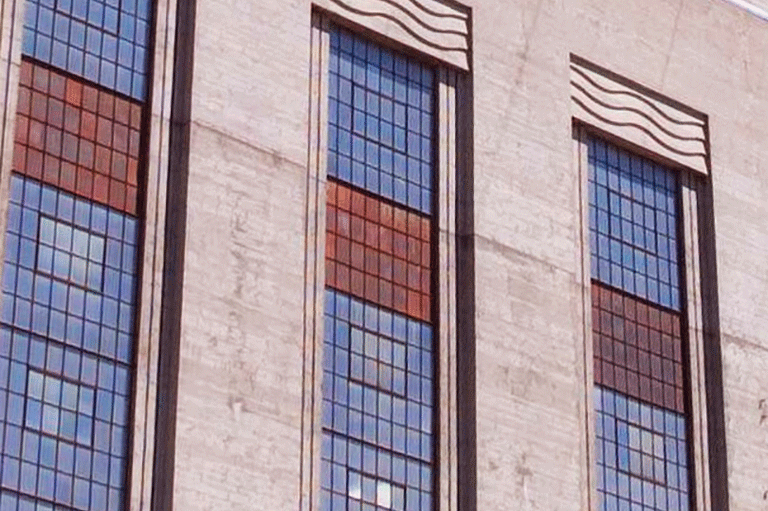 At the Seven Sisters Generating Station near Whitemouth, Man., wave motifs adorn the tops of the turbine hall’s multi-pane windows.Photo courtesy Manitoba Hydro.