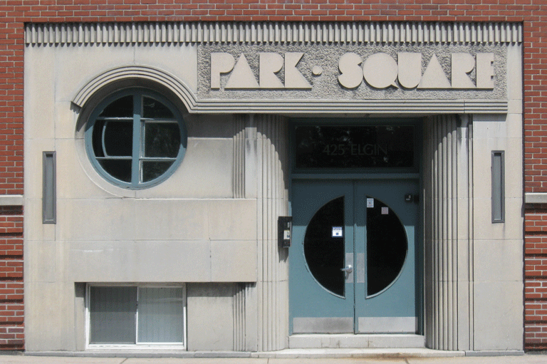 The carved stone entrance of Ottawa’s Park Square Apartments includes a bold art deco typeface that stands out from a rough-textured background.Photo Tim Morawetz -