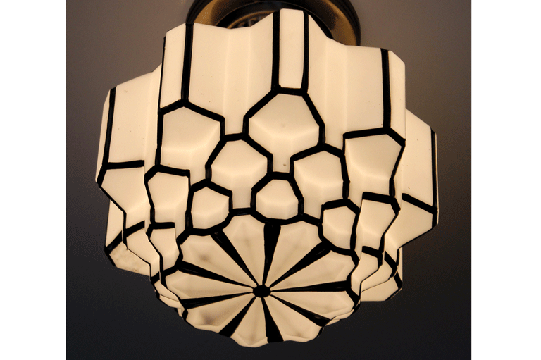 A boldly geometric frosted-glass fixture at the Women’s Tribute Memorial Lodge in Winnipeg.Photo Tim Morawetz -