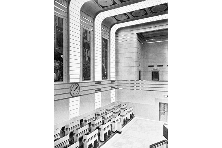 Panels of flashed opal glass formed continuous ribbons of light beside and above the trading floor of the 1937 Toronto Stock Exchange.Photo Toronto Public Library. -