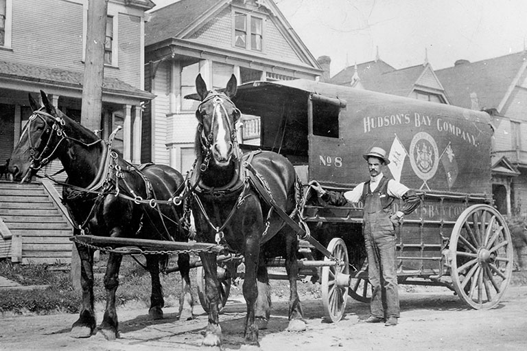 A Hudson's Bay Company delivery man stands beside his team of horses in Vancouver in 1906.HBC Archives -