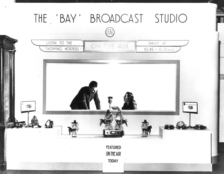 A sign alerts shoppers that HBC announcers are "on the air" during a 1940 broadcast from the Bay Broadcast Studio, located in the Calgary HBC store.HBC Archives -