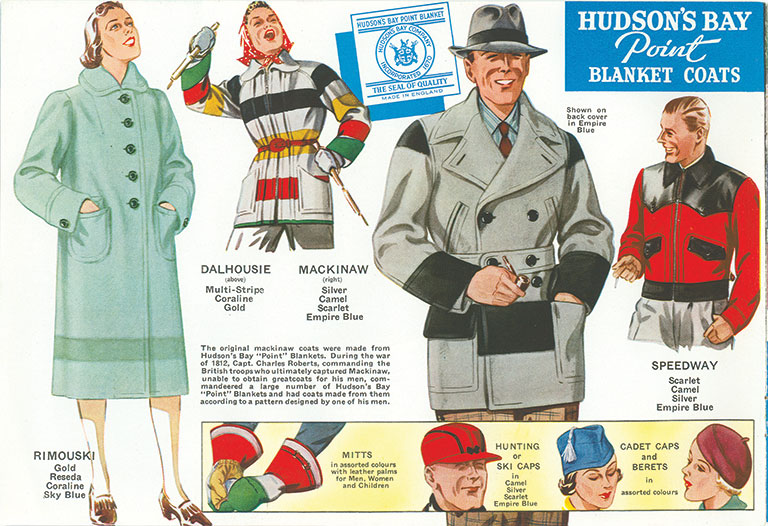 A 1939 brochure for Hudson's Bay blankets and blanket coats displays a selection of items including coats and mitts, hunting caps for men, and cadet caps for women.HBC Archives -