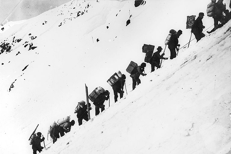 Fortune seekers climb the "golden stairs" of the Chilkoot Pass on their way to the Yukon gold fields, circa 1898-99.Library and Archives Canada -