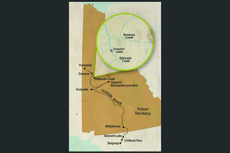 The map shows the Scouse party's route from Skagway north, first to the Stewart/McQuesten junction and then to Eldorado Creek, where a significant gold mine was found.Matthew Yathon