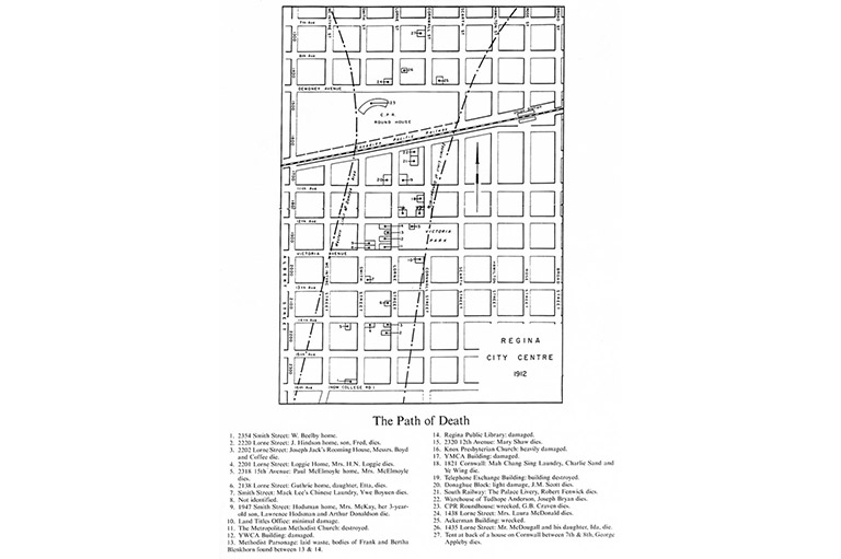 The damage done by the storm was concentrated along a narrow path through the centre of Regina between three and four hundred yards wide — barely three blocks — and nine blocks long. Within that small area, close to five hundred buildings were destroyed.
