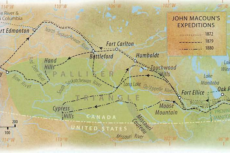A map detailing John Macoun's expeditions from 1872 through to 1880.Dawn Huck -