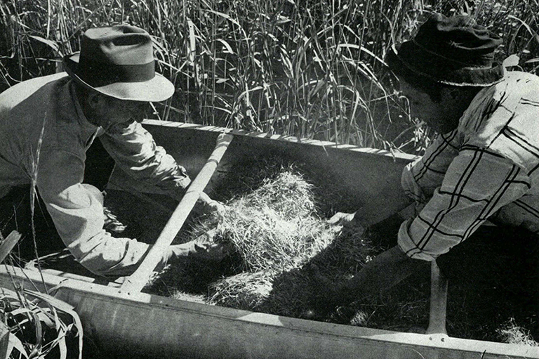 The hollow-stemmed wild rice, called menomin by the Ojibwa, grows from three to five feet or more high in water depths of eighteen to twenty-four inches where the bottom is soft, silty mud. As George Coon beats the rice, grains drop in the water, seeding next year’s crop and providing food for migrating ducks. In this manner the Ojibwas have been practising natural conservation for centuries. -