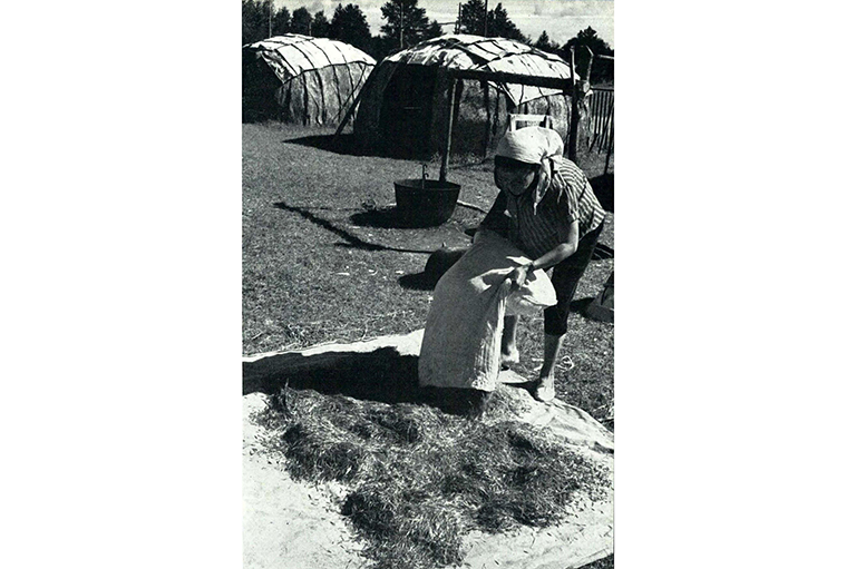 Though most rice is sold green for commercial processing, some is taken to the summer village for treatment in the traditional way. It is spread out on canvases to dry in the sun while women begin parching the 500 pounds collected the previous day. -