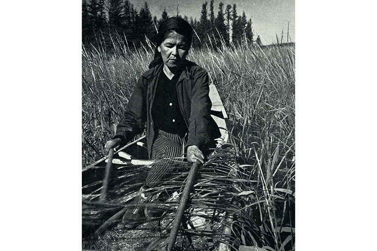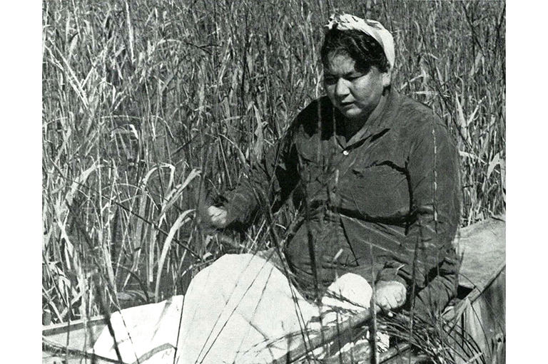 This way the rice would grow very large and ripe without falling and John said this made the very best eating. Each family had its own area to tie and harvest and this made gathering easier because ten or fifteen plants held together could all be knocked into the canoe at once. John also remembers the rush bags made by the women to store the finished rice for the winter — a staple food as long as it lasted.