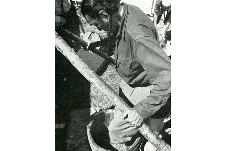 Parched rice is tramped in a wooden bucket, set on a skin in a depression in the ground. -