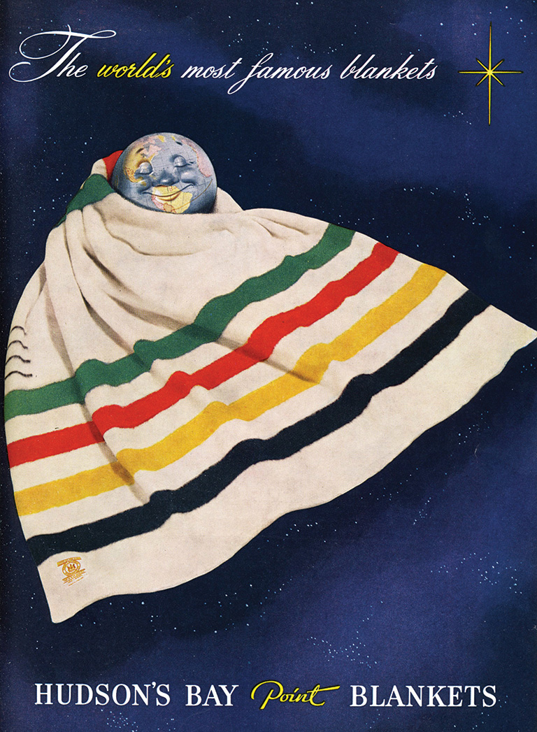 “Famous the world over, for a lifetime of luxurious comfort and warmth,” boasted the Hudson’s Bay Company, which made these blankets a regular trade item in 1780. The short black lines woven into the side of each blanket are called points, from the French empointer, and indicate the size and weight of the item. The now iconic blanket is shown here in a 1950s Beaver ad with the traditional colours of green, red, yellow, and indigo.