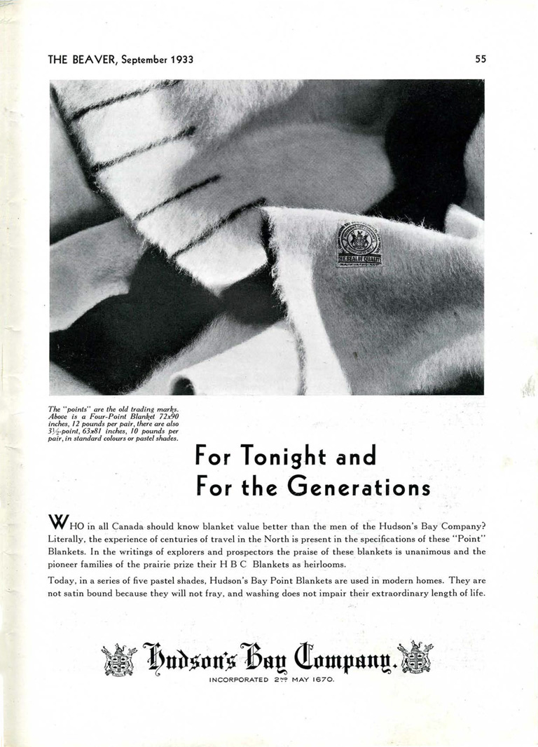 HBC blanket advertisement from the September 1933 issue of The Beaver.Canada's History -
