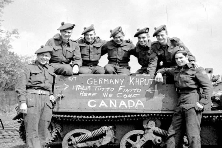 Members of the Seaforth Highlanders of Canada pose in the Netherlands on May 5, 1945, with a universal carrier that bears graffiti celebrating the defeats of Italy and Germany in the Second World War.Library and Archives Canada 3524685