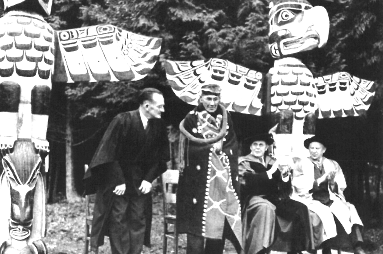 Carver Mungo Martin (standing centre) prepares to speak at the opening of a reconstructed Kwakiutl village at the University of British Columbia.Canada's History Society -