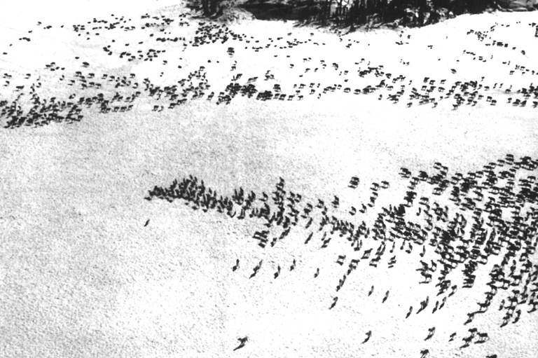 A.W.F. Banfield's aerial photo shows hundreds of caribou on their spring trek as a wolf, lower left, changes towards a cluster of animals.Canada's History Society -